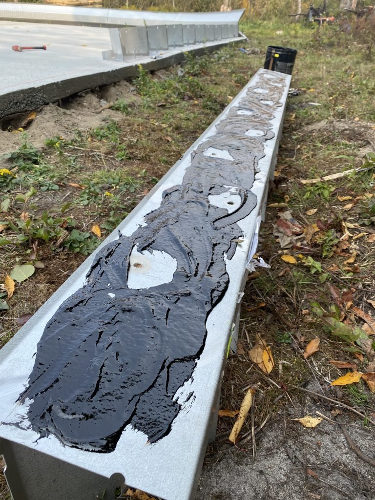 We applied tar to the bottom of each base plate section before bolting it into place.