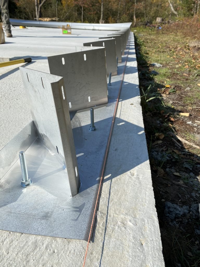 Once the base plates arrived, we set to work installing them. First, we laid out all of the sections so that we would know where the holes were. Then, we used a hammer drill (98 times!) to make 3” deep holes in our concrete pad. We coated the bottom of each base plate section with roofing tar to prevent water from seeping underneath the base plate. Finally, we bolted each section in place.