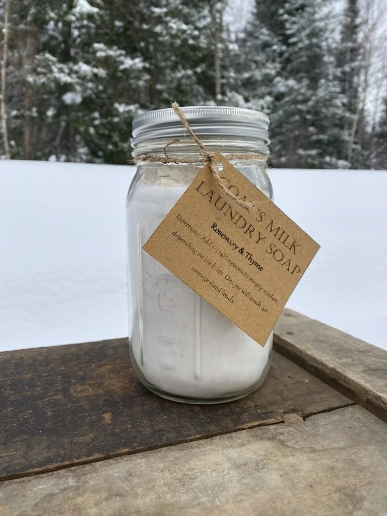 We've been using our own laundry soap exclusively for going on five years. Initially, we started making it as a way to use "ugly" bars of our goat's milk soap, but it has become so popular that we're now pulling "perfect" bars out of inventory to grate them up! It's made out of shredded bar soap, washing soda, borax, and baking soda. We package it in quart Mason jars (which can be reused infinitely), or we offer a bulk compostable bag-in-box option.
