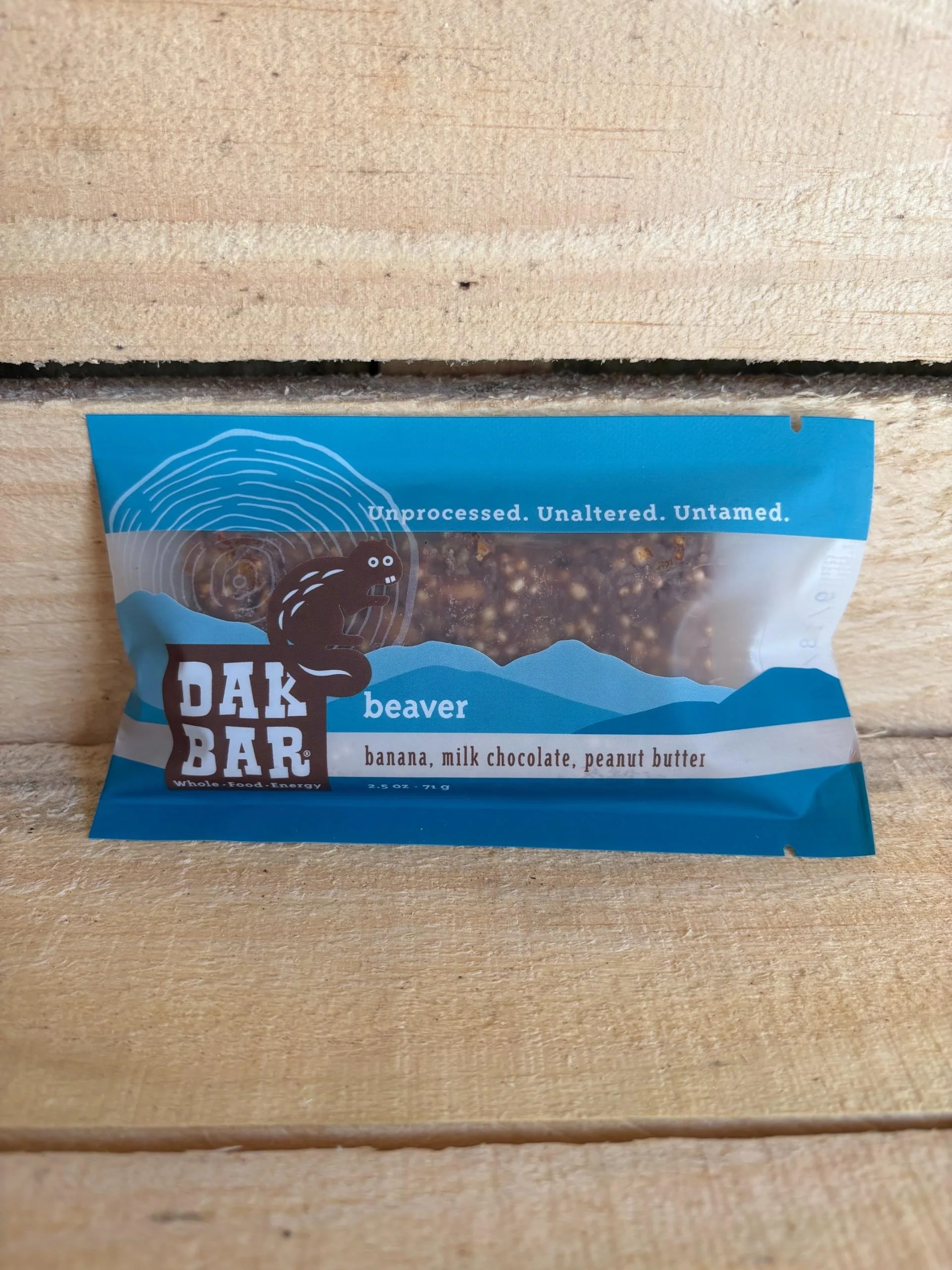 A 2.5 oz Dak Bar. Beaver is a combination of banana, milk chocolate, and peanut butter, plus a bunch of other healthy ingredients. Each bar contains 8 grams of protein.
